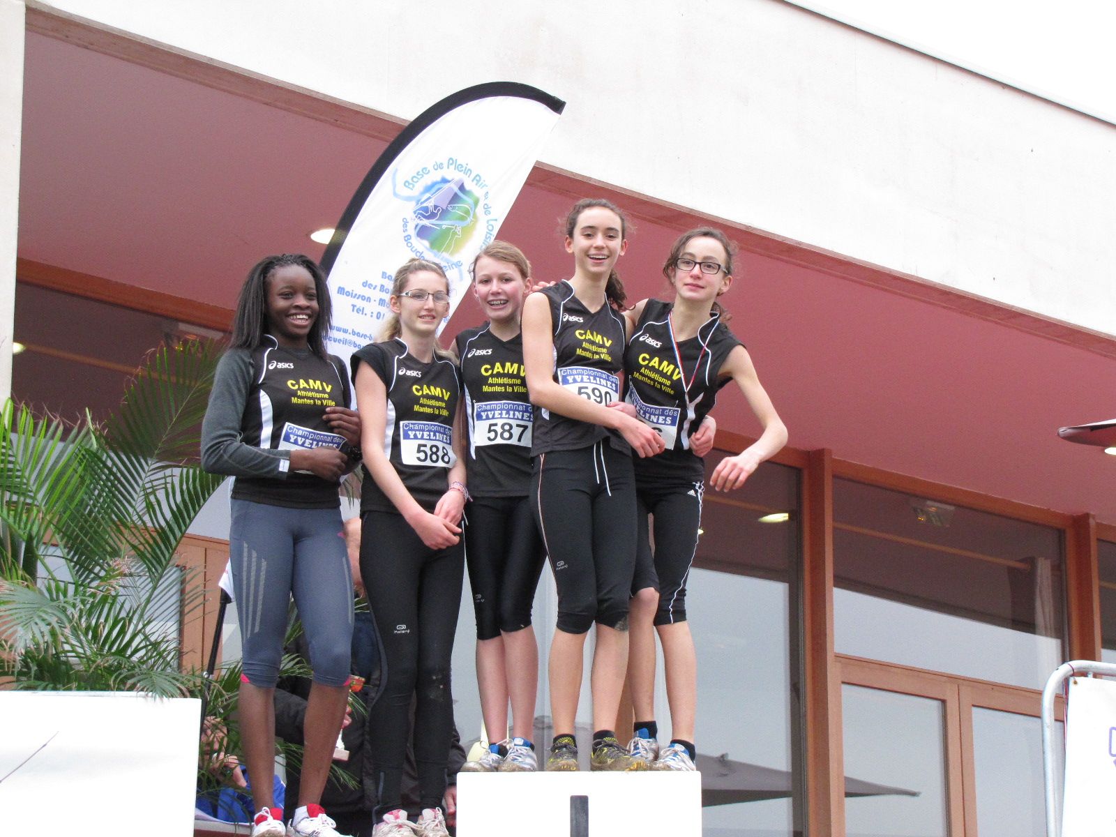 Victoire et titre départemental pour Louis CAETANO en minimes et Ayoub OUDAHAB en Benjamins ainsi que pour l'equipe Minimes Feminines (photo) avec des places en individuel très prometteuse. Julie BENTCHAKAL monte sur la 3ème place du podium, Lea LACHAMBRE prends la 4ème , Camille FOUBERT la 5ème et Edwige GOMIS la 20 ème, Edwige qui la veille a fait un pentathlon en salle au Val de Reuil . Pour etre complet sur cette equipe, on doit rajouter la courageuse Claire GAILLEMARD.